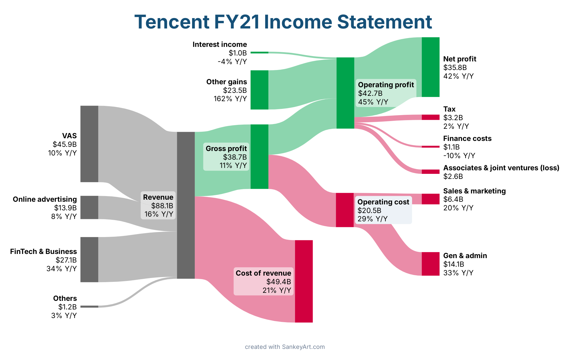 Revenue → Cost of revenue: $49.4BVAS → Revenue: $45.9BRevenue → Gross profit: $38.7BOperating profit → Net profit: $35.8BFinTech & Business → Revenue: $27.1BOther gains → Operating profit: $23.5BGross profit → Operating cost: $20.5BGross profit → Operating profit: $18.2BOperating cost → Gen & admin: $14.1BOnline advertising → Revenue: $13.9BOperating cost → Sales & marketing: $6.4BOperating profit → Tax: $3.2BOperating profit → Associates & joint ventures (loss): $2.6BOthers → Revenue: $1.2BOperating profit → Finance costs: $1.1BInterest income → Operating profit: $1.0BAssociates & joint ventures (loss)$2.6BCost of revenue$49.4B21% Y/YFinTech & Business$27.1B34% Y/YFinance costs$1.1B-10% Y/YGen & admin$14.1B33% Y/YGross profit$38.7B11% Y/YInterest income$1.0B-4% Y/YNet profit$35.8B42% Y/YOnline advertising$13.9B8% Y/YOperating profit$42.7B45% Y/YOther gains$23.5B162% Y/YOthers$1.2B3% Y/YRevenue$88.1B16% Y/YSales & marketing$6.4B20% Y/YTax$3.2B2% Y/YVAS$45.9B10% Y/YOperating cost$20.5B29% Y/YTencent FY21 Income Statementcreated with SankeyArt.com