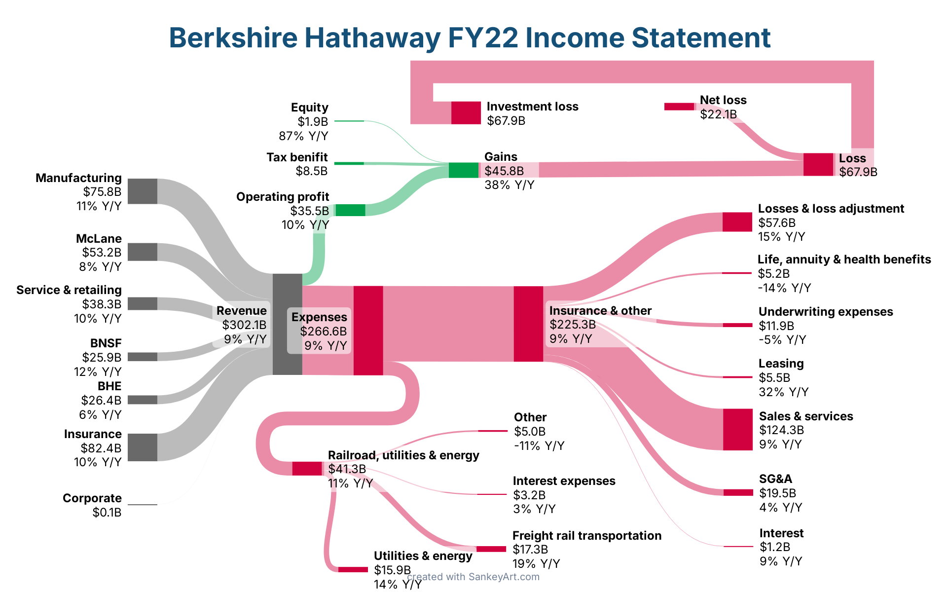 Revenue → Expenses: $266.6BExpenses → Insurance & other: $225.3BInsurance & other → Sales & services: $124.3BInsurance → Revenue: $82.4BManufacturing → Revenue: $75.8BLoss → Investment loss: $67.9BInsurance & other → Losses & loss adjustment: $57.6BMcLane → Revenue: $53.2BGains → Loss: $45.8BExpenses → Railroad, utilities & energy: $41.3BService & retailing → Revenue: $38.3BRevenue → Segment profit: $35.5BSegment profit → Gains: $35.5BBHE → Revenue: $26.4BBNSF → Revenue: $25.9BNet loss → Loss: $22.1BInsurance & other → SG&A: $19.5BRailroad, utilities & energy → Freight rail transportation: $17.3BRailroad, utilities & energy → Utilities & energy: $15.9BInsurance & other → Underwriting expenses: $11.9BTax benifit → Gains: $8.5BInsurance & other → Leasing: $5.5BInsurance & other → Life, annuity & health benefits: $5.2BRailroad, utilities & energy → Other: $5.0BRailroad, utilities & energy → Interest expenses: $3.2BEquity → Gains: $1.9BInsurance & other → Interest: $1.2BCorporate → Revenue: $0.1BBHE$26.4B6% Y/YBNSF$25.9B12% Y/YCorporate$0.1BEquity$1.9B87% Y/YExpenses$266.6B9% Y/YFreight rail transportation$17.3B19% Y/YGains$45.8B38% Y/YInsurance$82.4B10% Y/YInsurance & other$225.3B9% Y/YInterest$1.2B9% Y/YInterest expenses$3.2B3% Y/YInvestment loss$67.9BLeasing$5.5B32% Y/YLife, annuity & health benefits$5.2B-14% Y/YLoss$67.9BLosses & loss adjustment$57.6B15% Y/YManufacturing$75.8B11% Y/YMcLane$53.2B8% Y/YNet loss$22.1BOther$5.0B-11% Y/YRailroad, utilities & energy$41.3B11% Y/YRevenue$302.1B9% Y/YSG&A$19.5B4% Y/YSales & services$124.3B9% Y/YSegment profit$35.5B10% Y/YService & retailing$38.3B10% Y/YTax benifit$8.5BUnderwriting expenses$11.9B-5% Y/YUtilities & energy$15.9B14% Y/YBerkshire Hathaway FY22 Income Statementcreated with SankeyArt.com