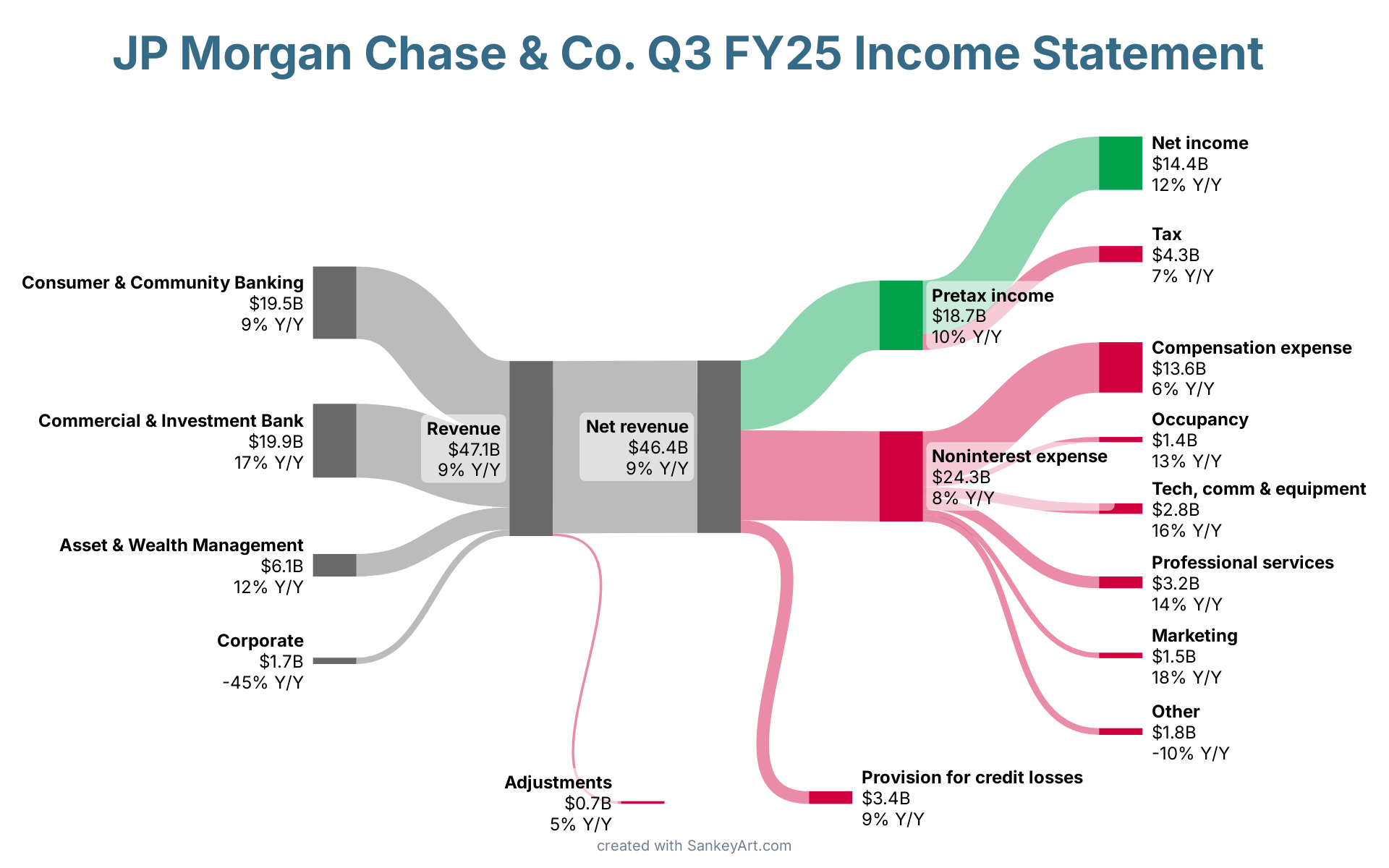 Revenue → Net revenue: $46.4BNet revenue → Noninterest expense: $24.3BCommercial & Investment Bank → Revenue: $19.9BConsumer & Community Banking → Revenue: $19.5BNet revenue → Pretax income: $18.7BPretax income → Net income: $14.4BNoninterest expense → Compensation expense: $13.6BAsset & Wealth Management → Revenue: $6.1BPretax income → Tax: $4.3BNet revenue → Provision for credit losses: $3.4BNoninterest expense → Professional services: $3.2BNoninterest expense → Tech, comm & equipment: $2.8BNoninterest expense → Other: $1.8BCorporate → Revenue: $1.7BNoninterest expense → Marketing: $1.5BNoninterest expense → Occupancy: $1.4BRevenue → Adjustments: $0.7BAdjustments$0.7B5% Y/YAsset & Wealth Management$6.1B12% Y/YCommercial & Investment Bank$19.9B17% Y/YCompensation expense$13.6B6% Y/YConsumer & Community Banking$19.5B9% Y/YCorporate$1.7B-45% Y/YMarketing$1.5B18% Y/YNet income$14.4B12% Y/YNet revenue$46.4B9% Y/YNoninterest expense$24.3B8% Y/YOccupancy$1.4B13% Y/YOther$1.8B-10% Y/YPretax income$18.7B10% Y/YProfessional services$3.2B14% Y/YProvision for credit losses$3.4B9% Y/YRevenue$47.1B9% Y/YTax$4.3B7% Y/YTech, comm & equipment$2.8B16% Y/YJP Morgan Chase & Co. Q3 FY25 Income Statementcreated with SankeyArt.com