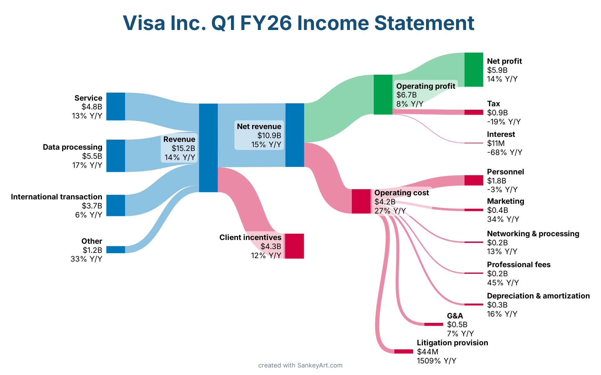 Revenue → Net revenue: $10.9BNet revenue → Operating profit: $6.7BOperating profit → Net profit: $5.9BData processing → Revenue: $5.5BService → Revenue: $4.8BRevenue → Client incentives: $4.3BNet revenue → Operating cost: $4.2BInternational transaction → Revenue: $3.7BOperating cost → Personnel: $1.8BOther → Revenue: $1.2BOperating profit → Tax: $0.9BOperating cost → Litigation provision: $0.7BOperating cost → G&A: $0.5BOperating cost → Marketing: $0.4BOperating cost → Depreciation & amortization: $0.3BOperating cost → Networking & processing: $0.2BOperating cost → Professional fees: $0.2BOperating profit → Interest: $0.0BClient incentives$4.3B12% Y/YData processing$5.5B17% Y/YDepreciation & amortization$0.3B16% Y/YG&A$0.5B7% Y/YInterest$11M-68% Y/YInternational transaction$3.7B6% Y/YLitigation provision$44M1509% Y/YMarketing$0.4B34% Y/YNet profit$5.9B14% Y/YNet revenue$10.9B15% Y/YNetworking & processing$0.2B13% Y/YOperating cost$4.2B27% Y/YOperating profit$6.7B8% Y/YOther$1.2B33% Y/YPersonnel$1.8B-3% Y/YProfessional fees$0.2B45% Y/YRevenue$15.2B14% Y/YService$4.8B13% Y/YTax$0.9B-19% Y/YVisa Inc. Q1 FY26 Income Statementcreated with SankeyArt.com