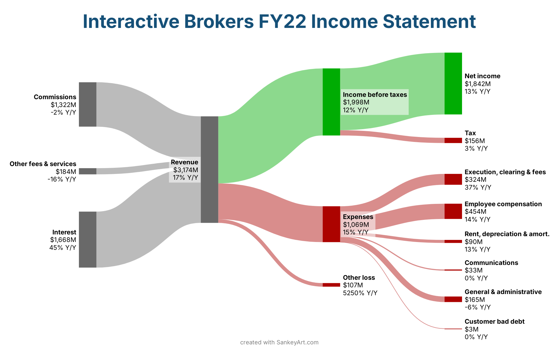 Revenue → Income before taxes: $1,998MIncome before taxes → Net income: $1,842MInterest → Revenue: $1,668MCommissions → Revenue: $1,322MRevenue → Expenses: $1,069MExpenses → Employee compensation: $454MExpenses → Execution, clearing & fees: $324MOther fees & services → Revenue: $184MExpenses → General & administrative: $165MIncome before taxes → Tax: $156MRevenue → Other loss: $107MExpenses → Rent, depreciation & amort.: $90MExpenses → Communications: $33MExpenses → Customer bad debt: $3MCommissions: $1,322MRevenue: $3,174MOther fees & services: $184MInterest: $1,668MIncome before taxes: $1,998MNet income: $1,842MTax: $156MExpenses: $1,069MExecution, clearing & fees: $324MEmployee compensation: $454MRent, depreciation & amort.: $90MCommunications: $33MGeneral & administrative: $165MCustomer bad debt: $3MOther loss: $107Mcreated with SankeyArt.comCommissions$1,322M-2% Y/YRevenue$3,174M17% Y/YOther fees & services$184M-16% Y/YInterest$1,668M45% Y/YIncome before taxes$1,998M12% Y/YNet income$1,842M13% Y/YTax$156M3% Y/YExpenses$1,069M15% Y/YExecution, clearing & fees$324M37% Y/YEmployee compensation$454M14% Y/YRent, depreciation & amort.$90M13% Y/YCommunications$33M0% Y/YGeneral & administrative$165M-6% Y/YCustomer bad debt$3M0% Y/YOther loss$107M5250% Y/YInteractive Brokers FY22 Income Statement