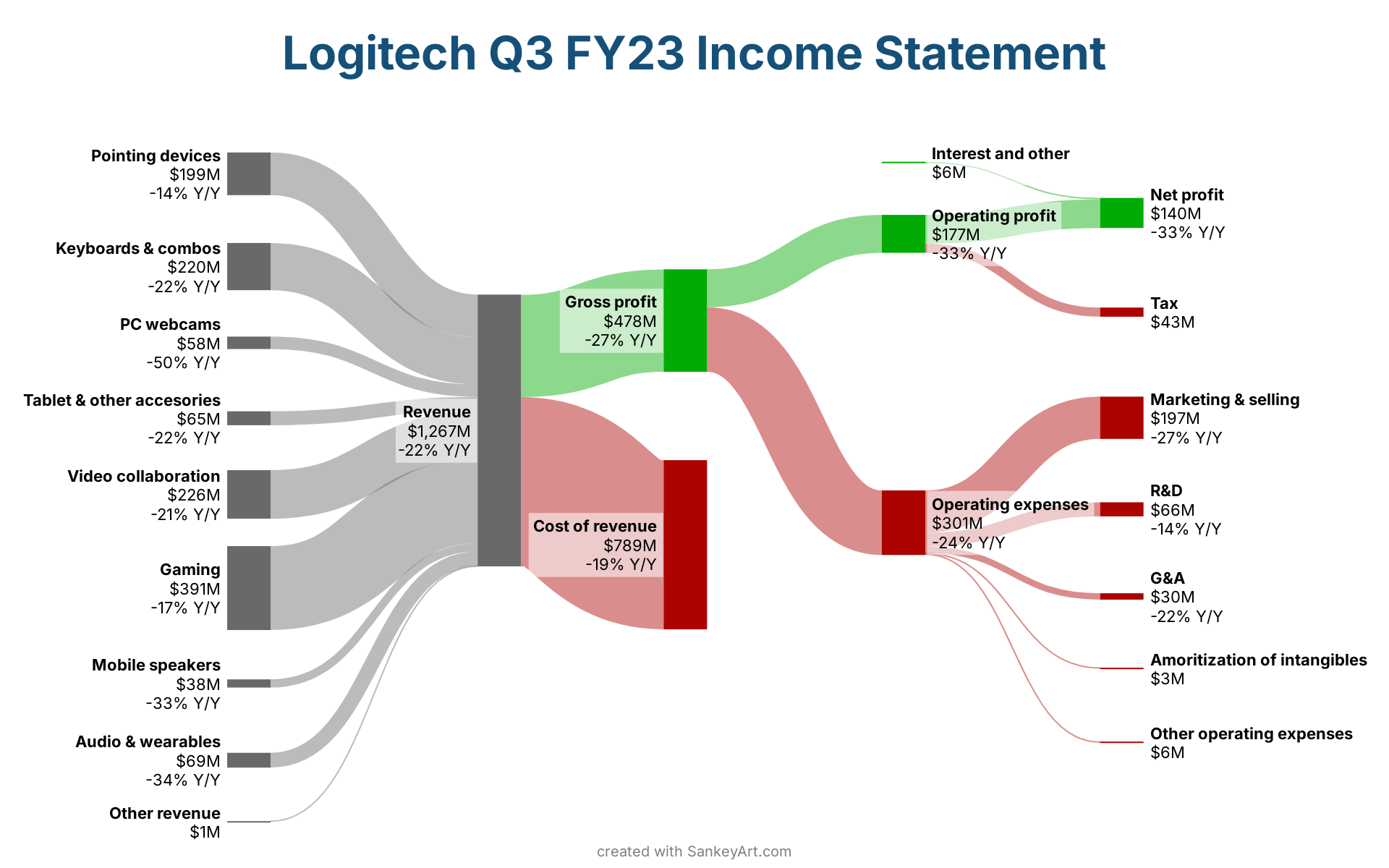 Revenue → Cost of revenue: $789MRevenue → Gross profit: $477MGaming → Revenue: $391MGross profit → Operating expenses: $301MVideo collaboration → Revenue: $226MKeyboards & combos → Revenue: $220MPointing devices → Revenue: $199MOperating expenses → Marketing & selling: $197MGross profit → Operating profit: $177MOperating profit → Net profit: $134MAudio & wearables → Revenue: $69MOperating expenses → R&D: $66MTablet & other accesories → Revenue: $65MPC webcams → Revenue: $58MOperating profit → Tax: $43MMobile speakers → Revenue: $38MOperating expenses → G&A: $30MInterest and other → Net profit: $6MOperating expenses → Other operating expenses: $6MOperating expenses → Amoritization of intangibles: $3MOther revenue → Revenue: $1MPointing devices: $199MRevenue: $1,267MKeyboards & combos: $220MPC webcams: $58MTablet & other accesories: $65MVideo collaboration: $226MGaming: $391MMobile speakers: $38MAudio & wearables: $69MOther revenue: $1MGross profit: $478MCost of revenue: $789MOperating profit: $177MNet profit: $140MInterest and other: $6MTax: $43MOperating expenses: $301MMarketing & selling: $197MR&D: $66MG&A: $30MAmoritization of intangibles: $3MOther operating expenses: $6Mcreated with SankeyArt.comPointing devices$199M-14% Y/YRevenue$1,267M-22% Y/YKeyboards & combos$220M-22% Y/YPC webcams$58M-50% Y/YTablet & other accesories$65M-22% Y/YVideo collaboration$226M-21% Y/YGaming$391M-17% Y/YMobile speakers$38M-33% Y/YAudio & wearables$69M-34% Y/YOther revenue$1MGross profit$478M-27% Y/YCost of revenue$789M-19% Y/YOperating profit$177M-33% Y/YNet profit$140M-33% Y/YInterest and other$6MTax$43MOperating expenses$301M-24% Y/YMarketing & selling$197M-27% Y/YR&D$66M-14% Y/YG&A$30M-22% Y/YAmoritization of intangibles$3MOther operating expenses$6MLogitech Q3 FY23 Income Statement