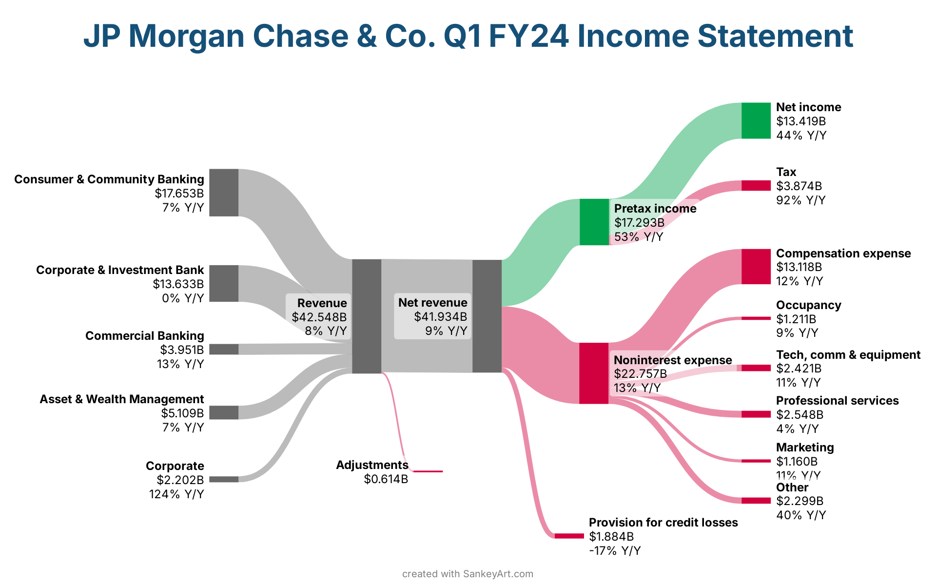 Revenue → Net revenue: $41.934BNet revenue → Noninterest expense: $22.757BConsumer & Community Banking → Revenue: $17.653BNet revenue → Pretax income: $17.293BCorporate & Investment Bank → Revenue: $13.633BPretax income → Net income: $13.419BNoninterest expense → Compensation expense: $13.118BAsset & Wealth Management → Revenue: $5.109BCommercial Banking → Revenue: $3.951BPretax income → Tax: $3.874BNoninterest expense → Professional services: $2.548BNoninterest expense → Tech, comm & equipment: $2.421BNoninterest expense → Other: $2.299BCorporate → Revenue: $2.202BNet revenue → Provision for credit losses: $1.884BNoninterest expense → Occupancy: $1.211BNoninterest expense → Marketing: $1.160BRevenue → Adjustments: $0.614BConsumer & Community Banking: $17.653BRevenue: $42.548BCorporate & Investment Bank: $13.633BCommercial Banking: $3.951BAsset & Wealth Management: $5.109BCorporate: $2.202BNet revenue: $41.934BAdjustments: $0.614BNoninterest expense: $22.757BProvision for credit losses: $1.884BPretax income: $17.293BCompensation expense: $13.118BOccupancy: $1.211BTech, comm & equipment: $2.421BProfessional services: $2.548BMarketing: $1.160BOther: $2.299BTax: $3.874BNet income: $13.419Bcreated with SankeyArt.comConsumer & Community Banking$17.653B7% Y/YRevenue$42.548B8% Y/YCorporate & Investment Bank$13.633B0% Y/YCommercial Banking$3.951B13% Y/YAsset & Wealth Management$5.109B7% Y/YCorporate$2.202B124% Y/YNet revenue$41.934B9% Y/YAdjustments$0.614BNoninterest expense$22.757B13% Y/YProvision for credit losses$1.884B-17% Y/YPretax income$17.293B53% Y/YCompensation expense$13.118B12% Y/YOccupancy$1.211B9% Y/YTech, comm & equipment$2.421B11% Y/YProfessional services$2.548B4% Y/YMarketing$1.160B11% Y/YOther$2.299B40% Y/YTax$3.874B92% Y/YNet income$13.419B44% Y/YJP Morgan Chase & Co. Q1 FY24 Income Statement