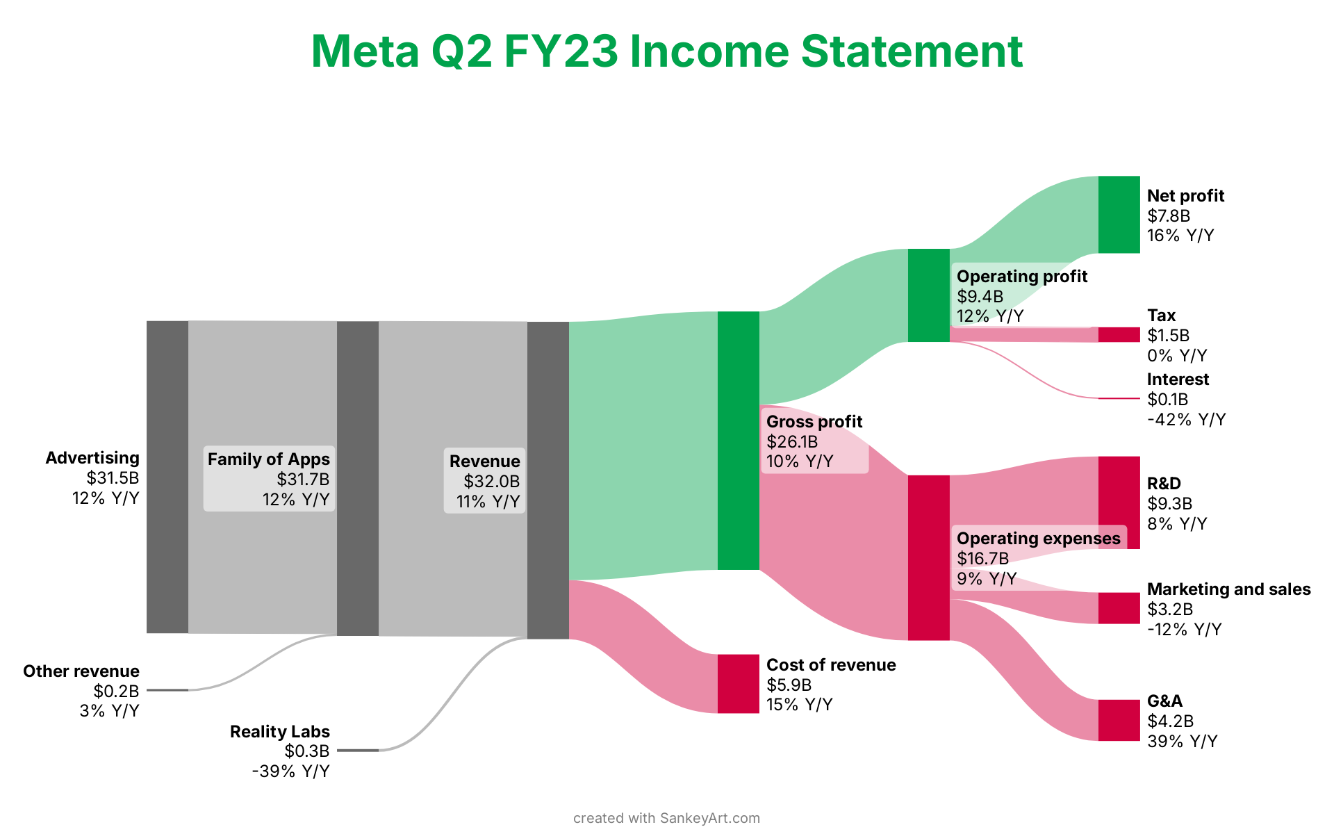 Family of Apps → Revenue: $31.7BAdvertising → Family of Apps: $31.5BRevenue → Gross profit: $26.1BGross profit → Operating expenses: $16.7BGross profit → Operating profit: $9.4BOperating expenses → R&D: $9.3BOperating profit → Net profit: $7.8BRevenue → Cost of revenue: $5.9BOperating expenses → G&A: $4.2BOperating expenses → Marketing and sales: $3.2BOperating profit → Tax: $1.5BReality Labs → Revenue: $0.3BOther revenue → Family of Apps: $0.2BOperating profit → Interest: $0.1BAdvertising: $31.5BFamily of Apps: $31.7BOther revenue: $0.2BRevenue: $32.0BReality Labs: $0.3BGross profit: $26.1BCost of revenue: $5.9BOperating profit: $9.4BOperating expenses: $16.7BNet profit: $7.8BTax: $1.5BInterest: $0.1BR&D: $9.3BMarketing and sales: $3.2BG&A: $4.2Bcreated with SankeyArt.comAdvertising$31.5B12% Y/YFamily of Apps$31.7B12% Y/YOther revenue$0.2B3% Y/YRevenue$32.0B11% Y/YReality Labs$0.3B-39% Y/YGross profit$26.1B10% Y/YCost of revenue$5.9B15% Y/YOperating profit$9.4B12% Y/YOperating expenses$16.7B9% Y/YNet profit$7.8B16% Y/YTax$1.5B0% Y/YInterest$0.1B-42% Y/YR&D$9.3B8% Y/YMarketing and sales$3.2B-12% Y/YG&A$4.2B39% Y/YMeta Q2 FY23 Income Statement