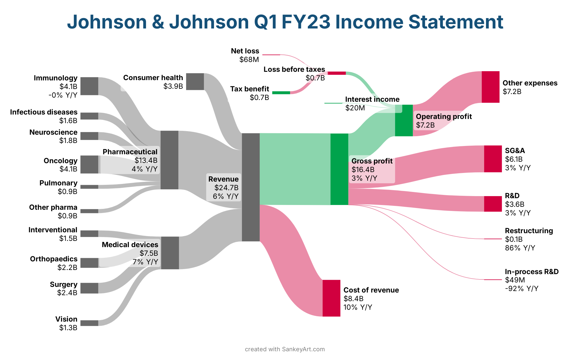 Revenue → Gross profit: $16.4BPharmaceutical → Revenue: $13.4BRevenue → Cost of revenue: $8.4BMedical devices → Revenue: $7.5BOperating profit → Other expenses: $7.2BGross profit → Operating profit: $6.5BGross profit → SG&A: $6.1BImmunology → Pharmaceutical: $4.1BOncology → Pharmaceutical: $4.1BConsumer health → Revenue: $3.9BGross profit → R&D: $3.6BSurgery → Medical devices: $2.4BOrthopaedics → Medical devices: $2.2BNeuroscience → Pharmaceutical: $1.8BInfectious diseases → Pharmaceutical: $1.6BInterventional → Medical devices: $1.5BVision → Medical devices: $1.3BOther pharma → Pharmaceutical: $0.9BPulmonary → Pharmaceutical: $0.9BLoss before taxes → Operating profit: $0.7BTax benefit → Loss before taxes: $0.7BGross profit → Restructuring: $0.1BNet loss → Loss before taxes: $0.1BGross profit → In-process R&D: $0.0BInterest income → Operating profit: $0.0BConsumer health: $3.9BRevenue: $24.7BImmunology: $4.1BPharmaceutical: $13.4BInfectious diseases: $1.6BNeuroscience: $1.8BOncology: $4.1BPulmonary: $0.9BOther pharma: $0.9BMedical devices: $7.5BInterventional: $1.5BOrthopaedics: $2.2BSurgery: $2.4BVision: $1.3BGross profit: $16.4BCost of revenue: $8.4BSG&A: $6.1BR&D: $3.6BIn-process R&D: $0.0BRestructuring: $0.1BOperating profit: $7.2BOther expenses: $7.2BNet loss: $0.1BLoss before taxes: $0.7BInterest income: $0.0BTax benefit: $0.7Bcreated with SankeyArt.comConsumer health$3.9BRevenue$24.7B6% Y/YImmunology$4.1B-0% Y/YPharmaceutical$13.4B4% Y/YInfectious diseases$1.6BNeuroscience$1.8BOncology$4.1BPulmonary$0.9BOther pharma$0.9BMedical devices$7.5B7% Y/YInterventional$1.5BOrthopaedics$2.2BSurgery$2.4BVision$1.3BGross profit$16.4B3% Y/YCost of revenue$8.4B10% Y/YSG&A$6.1B3% Y/YR&D$3.6B3% Y/YIn-process R&D$49M-92% Y/YRestructuring$0.1B86% Y/YOperating profit$7.2BOther expenses$7.2BNet loss$68MLoss before taxes$0.7BInterest income$20MTax benefit$0.7BJohnson & Johnson Q1 FY23 Income Statement