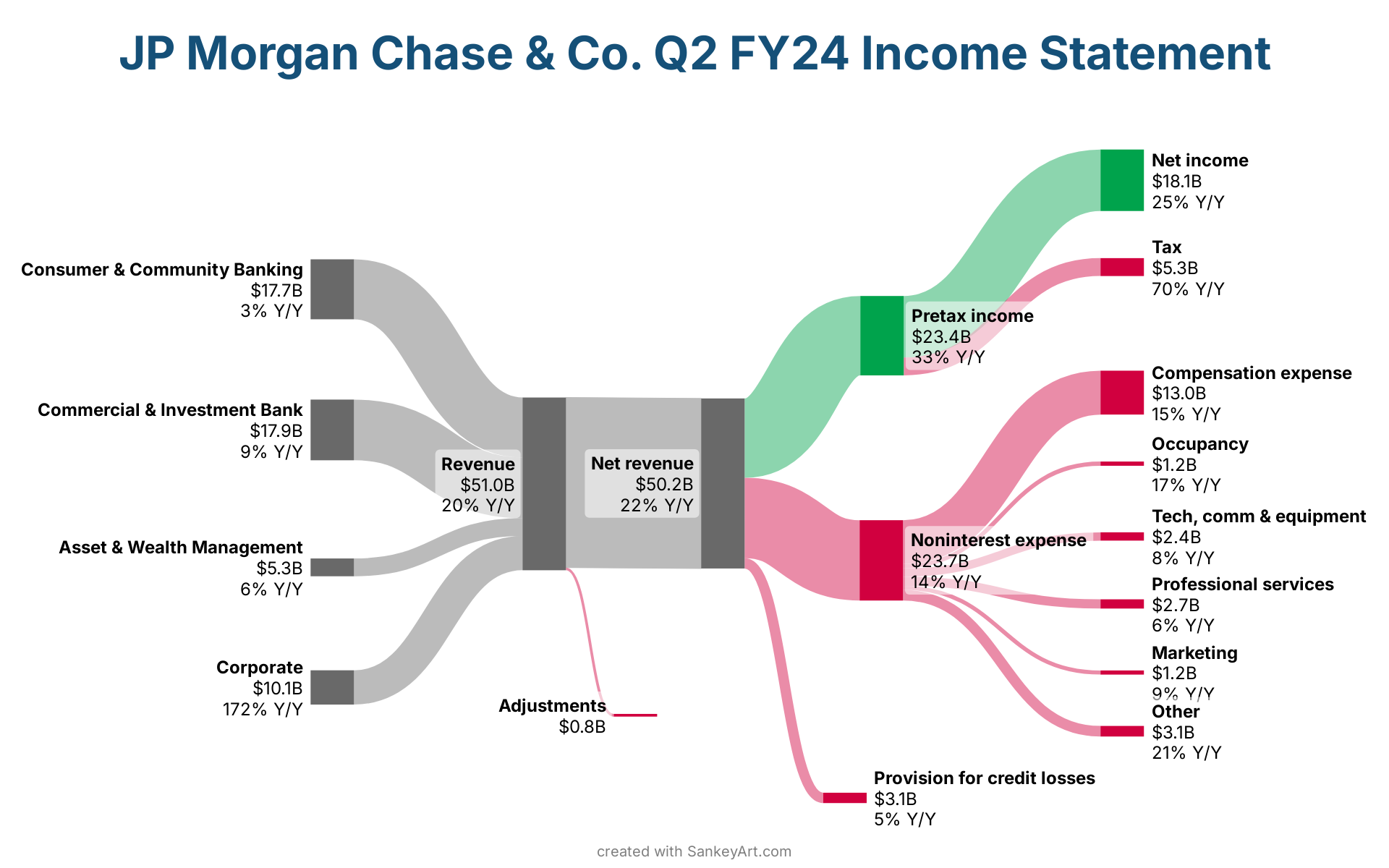Revenue → Net revenue: $50.2BNet revenue → Noninterest expense: $23.7BNet revenue → Pretax income: $23.4BPretax income → Net income: $18.1BCommercial & Investment Bank → Revenue: $17.9BConsumer & Community Banking → Revenue: $17.7BNoninterest expense → Compensation expense: $13.0BCorporate → Revenue: $10.1BPretax income → Tax: $5.3BAsset & Wealth Management → Revenue: $5.3BNoninterest expense → Other: $3.1BNet revenue → Provision for credit losses: $3.1BNoninterest expense → Professional services: $2.7BNoninterest expense → Tech, comm & equipment: $2.4BNoninterest expense → Occupancy: $1.2BNoninterest expense → Marketing: $1.2BRevenue → Adjustments: $0.8BConsumer & Community Banking: $17.7BRevenue: $51.0BCommercial & Investment Bank: $17.9BAsset & Wealth Management: $5.3BCorporate: $10.1BNet revenue: $50.2BAdjustments: $0.8BNoninterest expense: $23.7BProvision for credit losses: $3.1BPretax income: $23.4BCompensation expense: $13.0BOccupancy: $1.2BTech, comm & equipment: $2.4BProfessional services: $2.7BMarketing: $1.2BOther: $3.1BTax: $5.3BNet income: $18.1Bcreated with SankeyArt.comConsumer & Community Banking$17.7B3% Y/YRevenue$51.0B20% Y/YCommercial & Investment Bank$17.9B9% Y/YAsset & Wealth Management$5.3B6% Y/YCorporate$10.1B172% Y/YNet revenue$50.2B22% Y/YAdjustments$0.8BNoninterest expense$23.7B14% Y/YProvision for credit losses$3.1B5% Y/YPretax income$23.4B33% Y/YCompensation expense$13.0B15% Y/YOccupancy$1.2B17% Y/YTech, comm & equipment$2.4B8% Y/YProfessional services$2.7B6% Y/YMarketing$1.2B9% Y/YOther$3.1B21% Y/YTax$5.3B70% Y/YNet income$18.1B25% Y/YJP Morgan Chase & Co. Q2 FY24 Income Statement