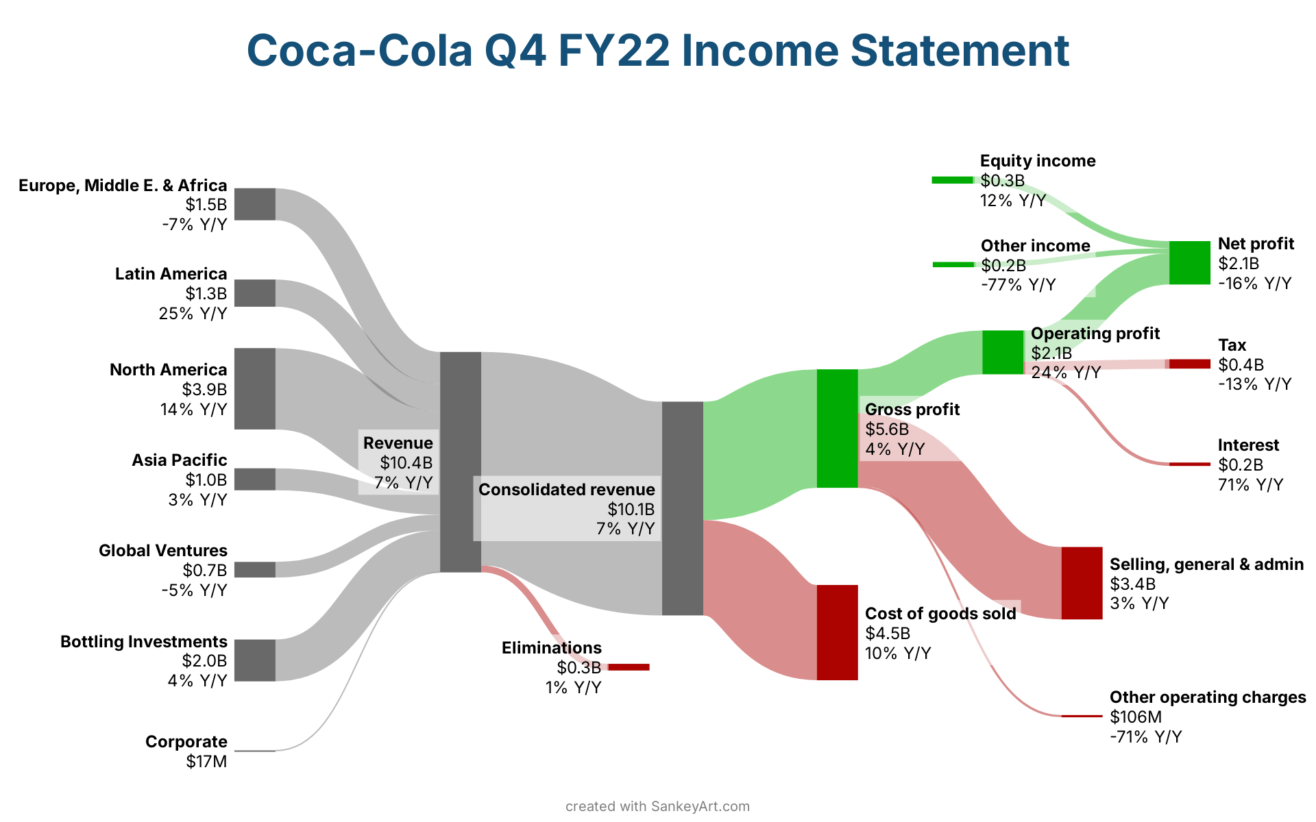 Revenue → Consolidated revenue: $10.1BConsolidated revenue → Gross profit: $5.6BConsolidated revenue → Cost of goods sold: $4.5BNorth America → Revenue: $3.9BGross profit → Selling, general & admin: $3.4BGross profit → Operating profit: $2.1BBottling Investments → Revenue: $2.0BEurope, Middle E. & Africa → Revenue: $1.5BOperating profit → Net profit: $1.5BLatin America → Revenue: $1.3BAsia Pacific → Revenue: $1.0BGlobal Ventures → Revenue: $0.7BOperating profit → Tax: $0.4BEquity income → Net profit: $0.3BRevenue → Eliminations: $0.3BOther income → Net profit: $0.2BOperating profit → Interest: $0.2BGross profit → Other operating charges: $0.1BCorporate → Revenue: $0.0BEurope, Middle E. & Africa: $1.5BRevenue: $10.4BLatin America: $1.3BNorth America: $3.9BAsia Pacific: $1.0BGlobal Ventures: $0.7BBottling Investments: $2.0BCorporate: $0.0BConsolidated revenue: $10.1BEliminations: $0.3BGross profit: $5.6BCost of goods sold: $4.5BOperating profit: $2.1BNet profit: $2.1BEquity income: $0.3BTax: $0.4BInterest: $0.2BOther income: $0.2BSelling, general & admin: $3.4BOther operating charges: $0.1Bcreated with SankeyArt.comEurope, Middle E. & Africa$1.5B-7% Y/YRevenue$10.4B7% Y/YLatin America$1.3B25% Y/YNorth America$3.9B14% Y/YAsia Pacific$1.0B3% Y/YGlobal Ventures$0.7B-5% Y/YBottling Investments$2.0B4% Y/YCorporate$17MConsolidated revenue$10.1B7% Y/YEliminations$0.3B1% Y/YGross profit$5.6B4% Y/YCost of goods sold$4.5B10% Y/YOperating profit$2.1B24% Y/YNet profit$2.1B-16% Y/YEquity income$0.3B12% Y/YTax$0.4B-13% Y/YInterest$0.2B71% Y/YOther income$0.2B-77% Y/YSelling, general & admin$3.4B3% Y/YOther operating charges$106M-71% Y/YCoca-Cola Q4 FY22 Income Statement