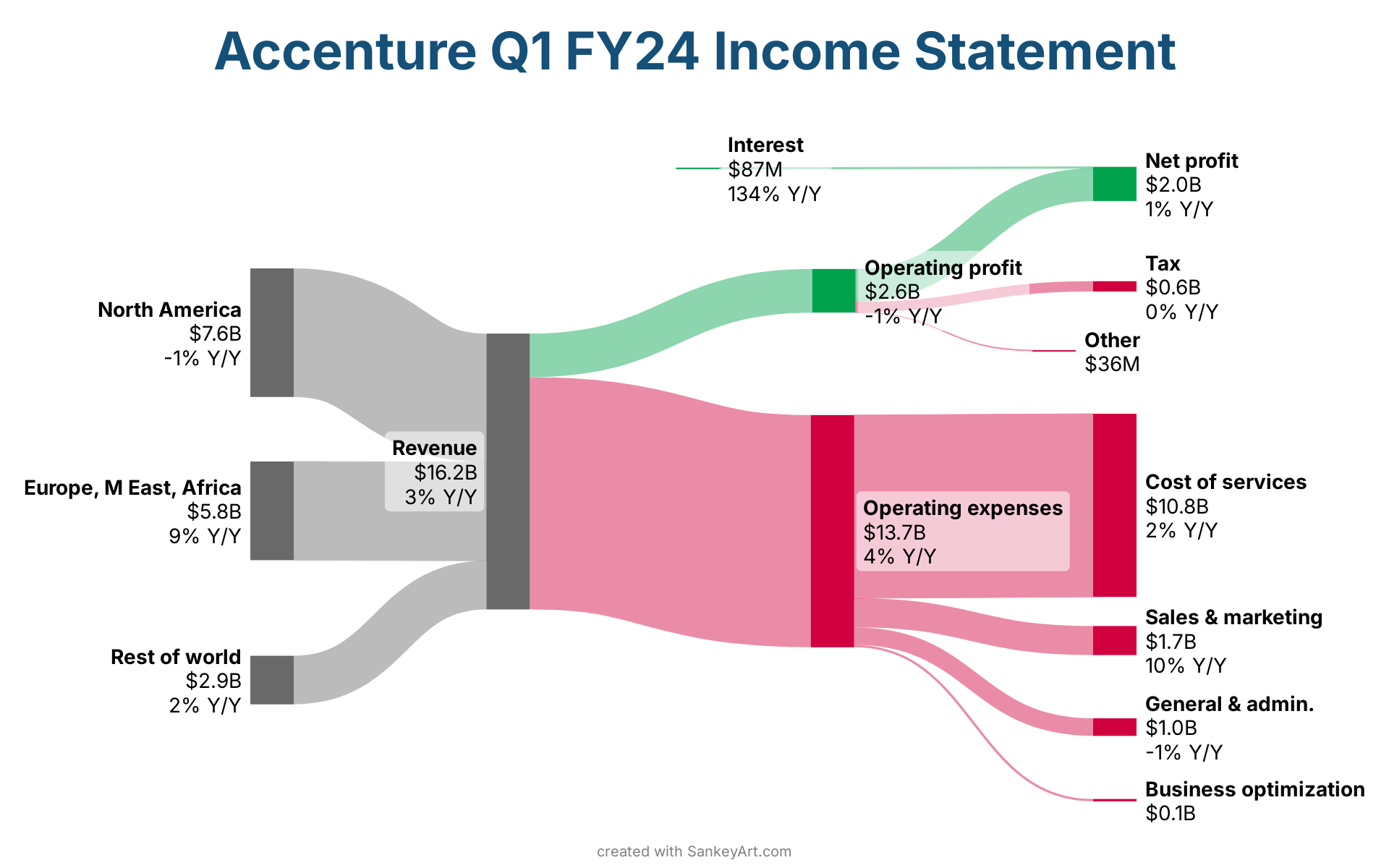 Revenue → Operating expenses: $13.7BOperating expenses → Cost of services: $10.8BNorth America → Revenue: $7.6BEurope, M East, Africa → Revenue: $5.8BRest of world → Revenue: $2.9BRevenue → Operating profit: $2.6BOperating profit → Net profit: $1.9BOperating expenses → Sales & marketing: $1.7BOperating expenses → General & admin.: $1.0BOperating profit → Tax: $0.6BOperating expenses → Business optimization: $0.1BInterest → Net profit: $0.1BOperating profit → Other: $0.0BNorth America: $7.6BRevenue: $16.2BEurope, M East, Africa: $5.8BRest of world: $2.9BOperating profit: $2.6BOperating expenses: $13.7BInterest: $0.1BNet profit: $2.0BTax: $0.6BOther: $0.0BCost of services: $10.8BSales & marketing: $1.7BGeneral & admin.: $1.0BBusiness optimization: $0.1Bcreated with SankeyArt.comNorth America$7.6B-1% Y/YRevenue$16.2B3% Y/YEurope, M East, Africa$5.8B9% Y/YRest of world$2.9B2% Y/YOperating profit$2.6B-1% Y/YOperating expenses$13.7B4% Y/YInterest$87M134% Y/YNet profit$2.0B1% Y/YTax$0.6B0% Y/YOther$36MCost of services$10.8B2% Y/YSales & marketing$1.7B10% Y/YGeneral & admin.$1.0B-1% Y/YBusiness optimization$0.1BAccenture Q1 FY24 Income Statement