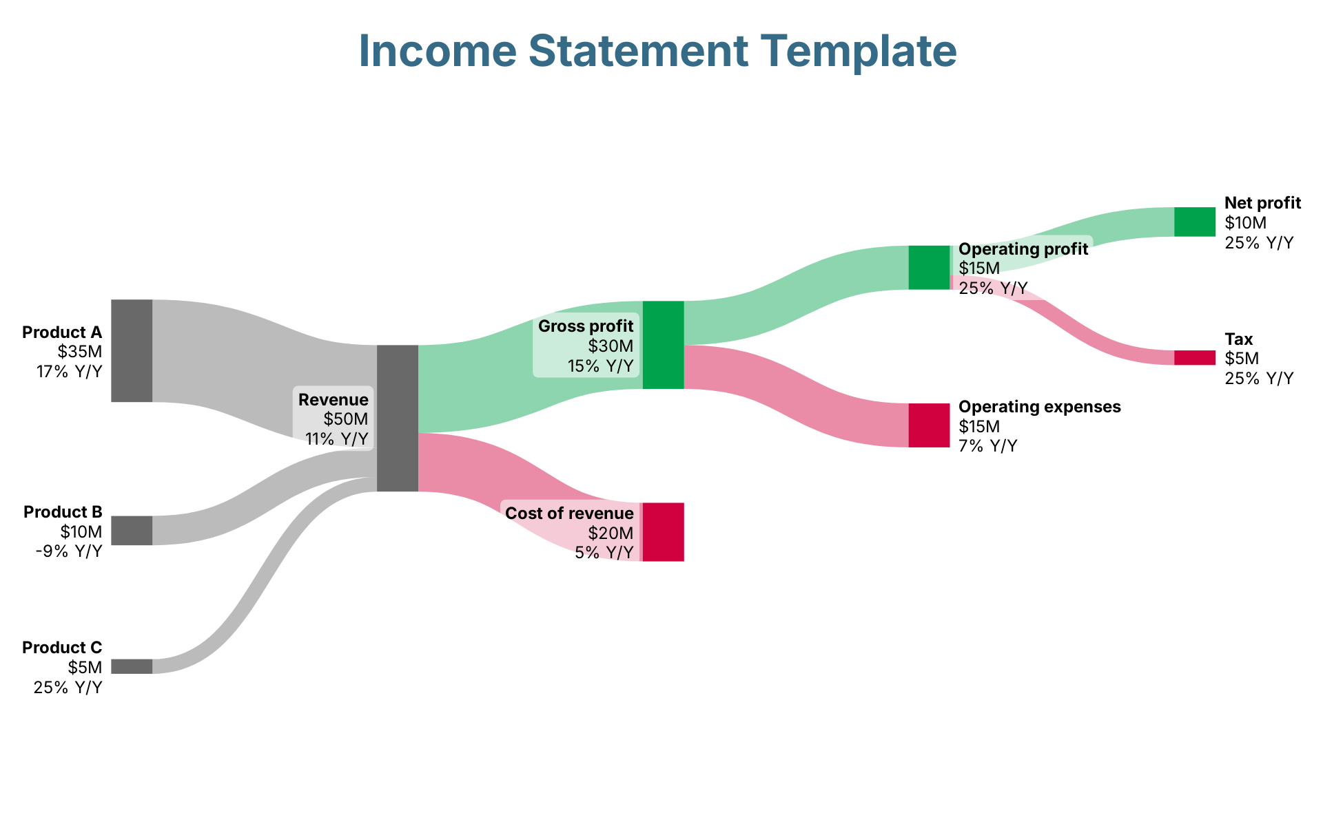 Product A → Revenue: $35MRevenue → Gross profit: $30MRevenue → Cost of revenue: $20MGross profit → Operating profit: $15MGross profit → Operating expenses: $15MProduct B → Revenue: $10MOperating profit → Net profit: $10MProduct C → Revenue: $5MOperating profit → Tax: $5MCost of revenue$20M5% Y/YGross profit$30M15% Y/YNet profit$10M25% Y/YOperating expenses$15M7% Y/YOperating profit$15M25% Y/YProduct A$35M17% Y/YProduct B$10M-9% Y/YProduct C$5M25% Y/YRevenue$50M11% Y/YTax$5M25% Y/YIncome Statement Template