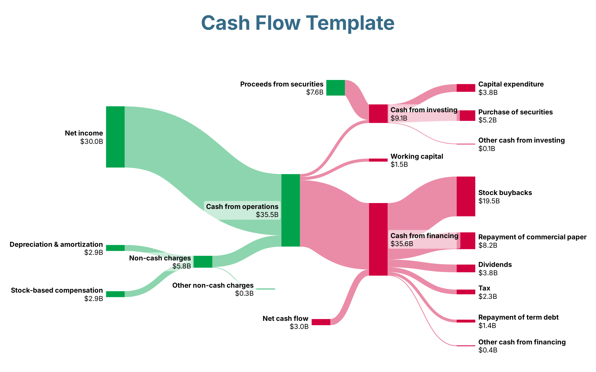 Cash from operations → Cash from financing: $32.6BNet income → Cash from operations: $30.0BCash from financing → Stock buybacks: $19.5BCash from financing → Repayment of commercial paper: $8.2BProceeds from securities → Cash from investing: $7.6BNon-cash charges → Cash from operations: $5.5BCash from investing → Purchase of securities: $5.2BCash from investing → Capital expenditure: $3.8BCash from financing → Dividends: $3.8BNet cash flow → Cash from financing: $3.0BDepreciation & amortization → Non-cash charges: $2.9BStock-based compensation → Non-cash charges: $2.9BCash from financing → Tax: $2.3BCash from operations → Working capital: $1.5BCash from operations → Cash from investing: $1.4BCash from financing → Repayment of term debt: $1.4BCash from financing → Other cash from financing: $0.4BNon-cash charges → Other non-cash charges: $0.3BCash from investing → Other cash from investing: $0.1BNet income: $30.0BCash from operations: $35.5BDepreciation & amortization: $2.9BNon-cash charges: $5.8BStock-based compensation: $2.9BOther non-cash charges: $0.3BWorking capital: $1.5BCash from investing: $9.1BCapital expenditure: $3.8BPurchase of securities: $5.2BProceeds from securities: $7.6BOther cash from investing: $0.1BCash from financing: $35.6BNet cash flow: $3.0BStock buybacks: $19.5BRepayment of commercial paper: $8.2BDividends: $3.8BTax: $2.3BRepayment of term debt: $1.4BOther cash from financing: $0.4BNet income$30.0BCash from operations$35.5BDepreciation & amortization$2.9BNon-cash charges$5.8BStock-based compensation$2.9BOther non-cash charges$0.3BWorking capital$1.5BCash from investing$9.1BCapital expenditure$3.8BPurchase of securities$5.2BProceeds from securities$7.6BOther cash from investing$0.1BCash from financing$35.6BNet cash flow$3.0BStock buybacks$19.5BRepayment of commercial paper$8.2BDividends$3.8BTax$2.3BRepayment of term debt$1.4BOther cash from financing$0.4BCash Flow Template
