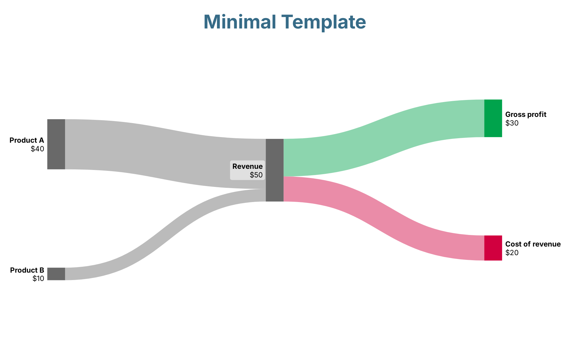 Product A → Revenue: $40Revenue → Gross profit: $30Revenue → Cost of revenue: $20Product B → Revenue: $10Cost of revenue$20Gross profit$30Product A$40Product B$10Revenue$50Minimal Template