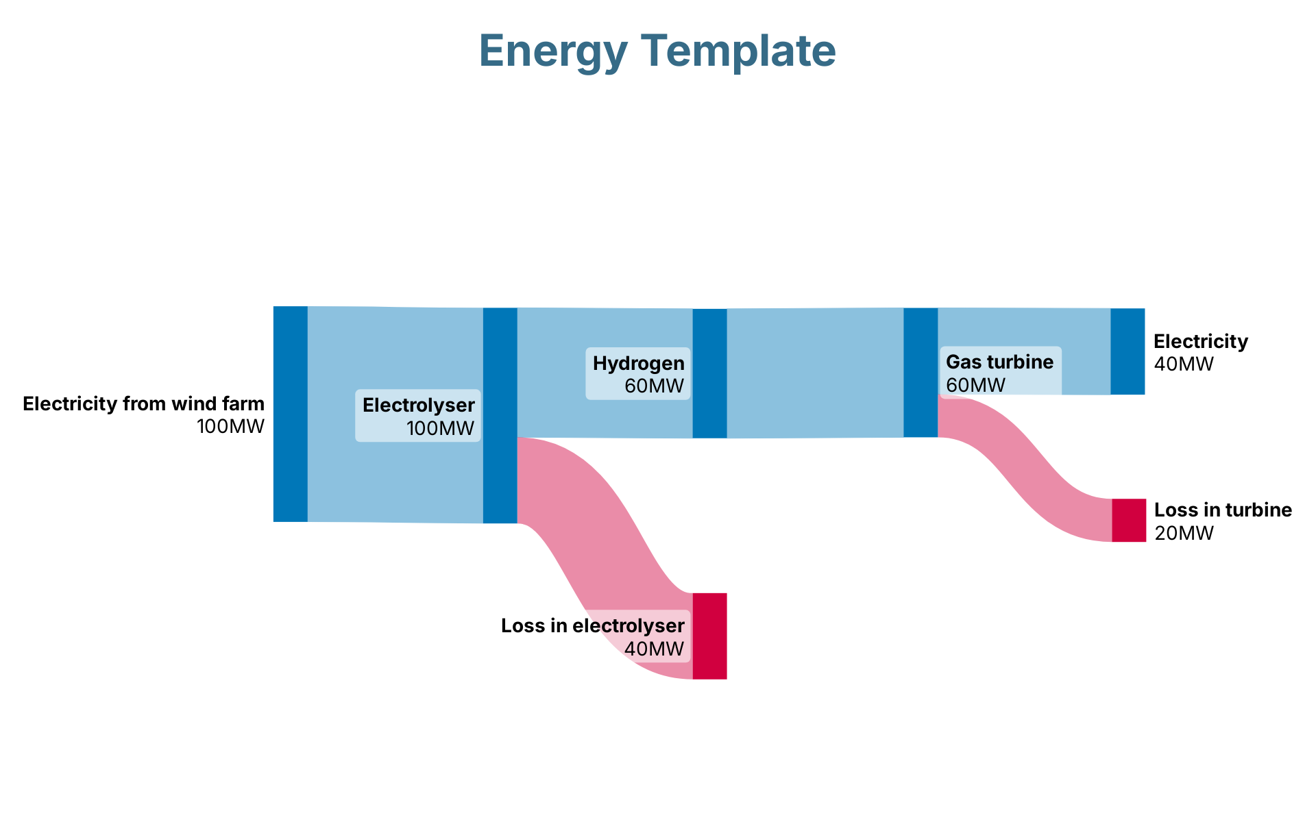 Electricity from wind farm → Electrolyser: 100MWElectrolyser → Hydrogen: 60MWHydrogen → Gas turbine: 60MWElectrolyser → Loss in electrolyser: 40MWGas turbine → Electricity: 40MWGas turbine → Loss in turbine: 20MWElectricity from wind farm: 100MWElectrolyser: 100MWHydrogen: 60MWLoss in electrolyser: 40MWGas turbine: 60MWElectricity: 40MWLoss in turbine: 20MWElectricity from wind farm100MWElectrolyser100MWHydrogen60MWLoss in electrolyser40MWGas turbine60MWElectricity40MWLoss in turbine20MWEnergy Template